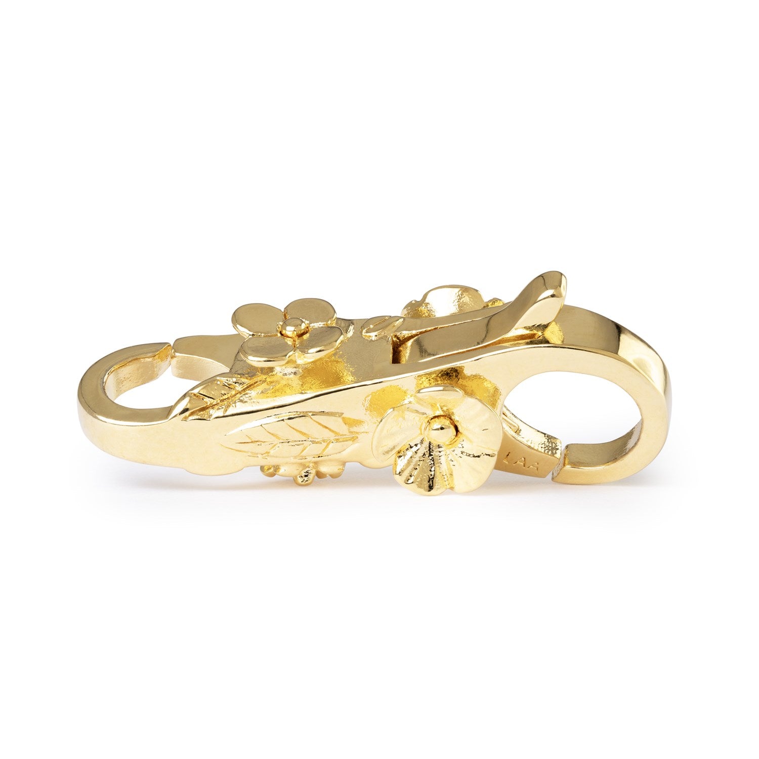 A detailed clasp decorated with blooming flowers and leaves. The design symbolises connection and growth, bringing each story together in one gentle flow.