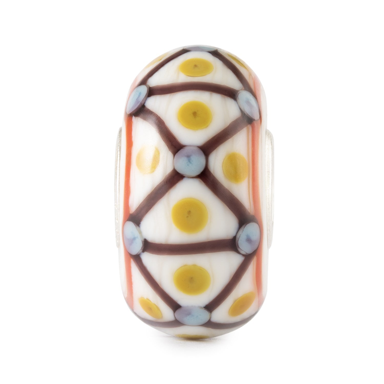 This glass bead has a classic shape and smooth surface. It is crafted in brown, orange, blue and yellow in the shape of dots and stripes on a white background. Subtle patterns and delicate details give it the feeling of a handcrafted woolen texture — comforting, familiar, and uniquely yours. A sterling silver core adds a refined finish, making it as enduring as it is radiant.