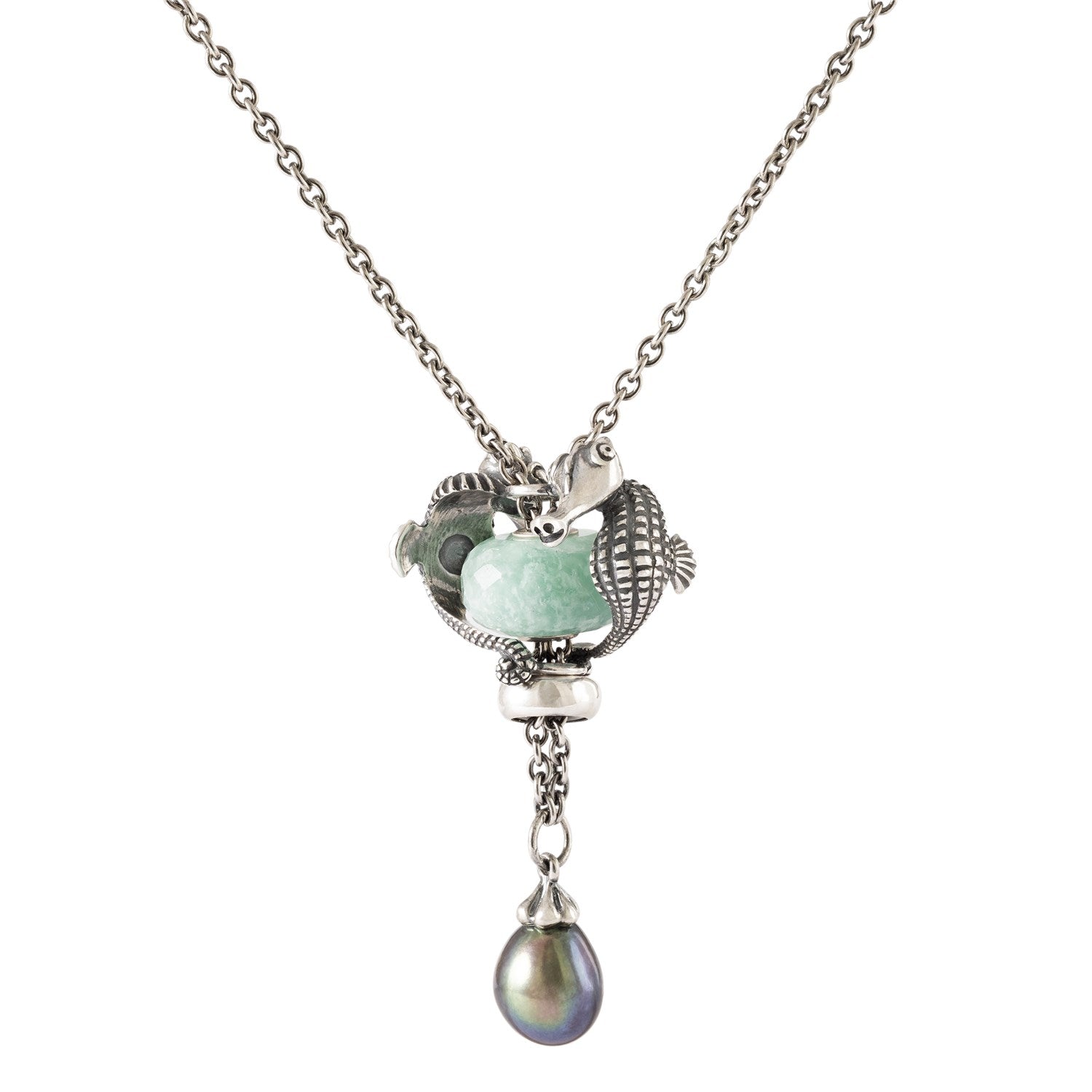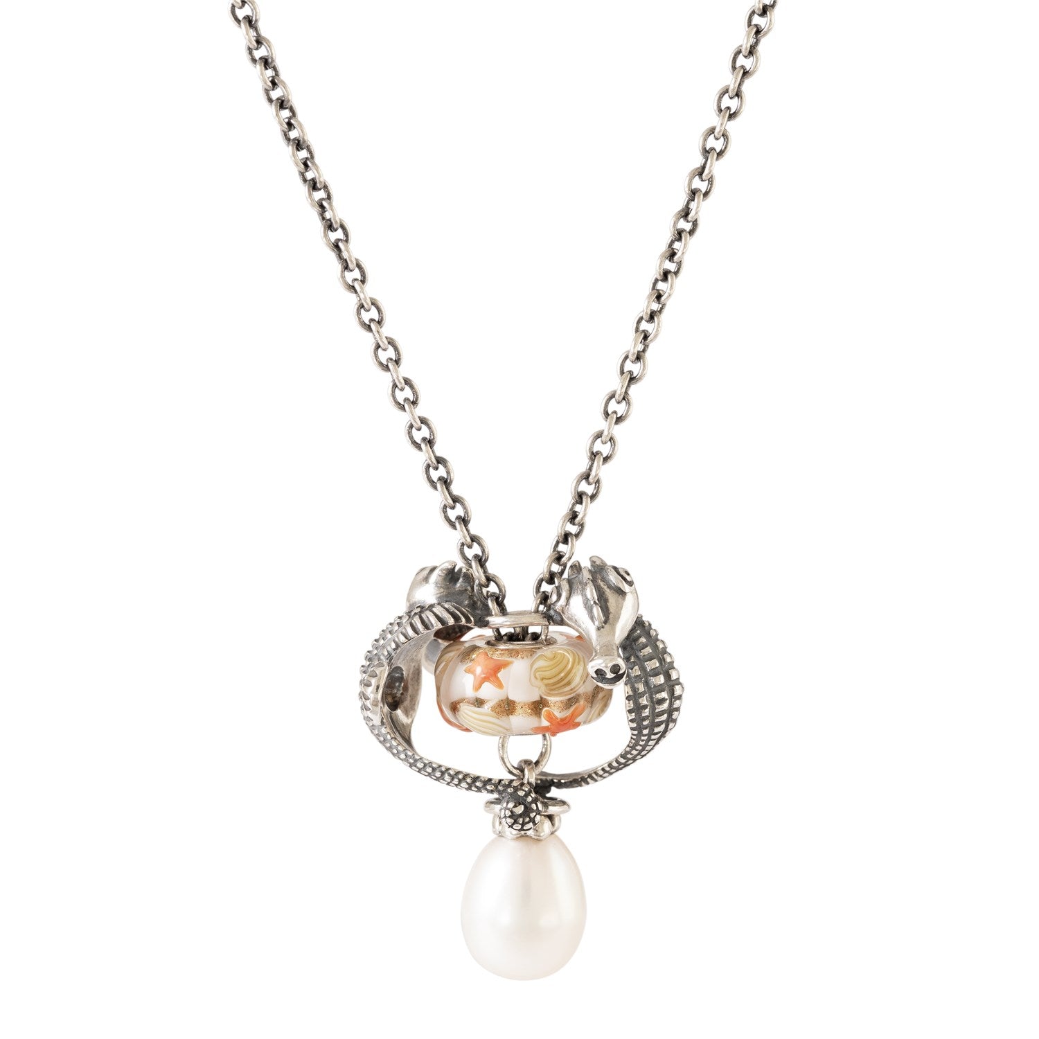 This necklace pendant features two intricately detailed seahorses in sterling silver, swimming majestically around your favourite bead.