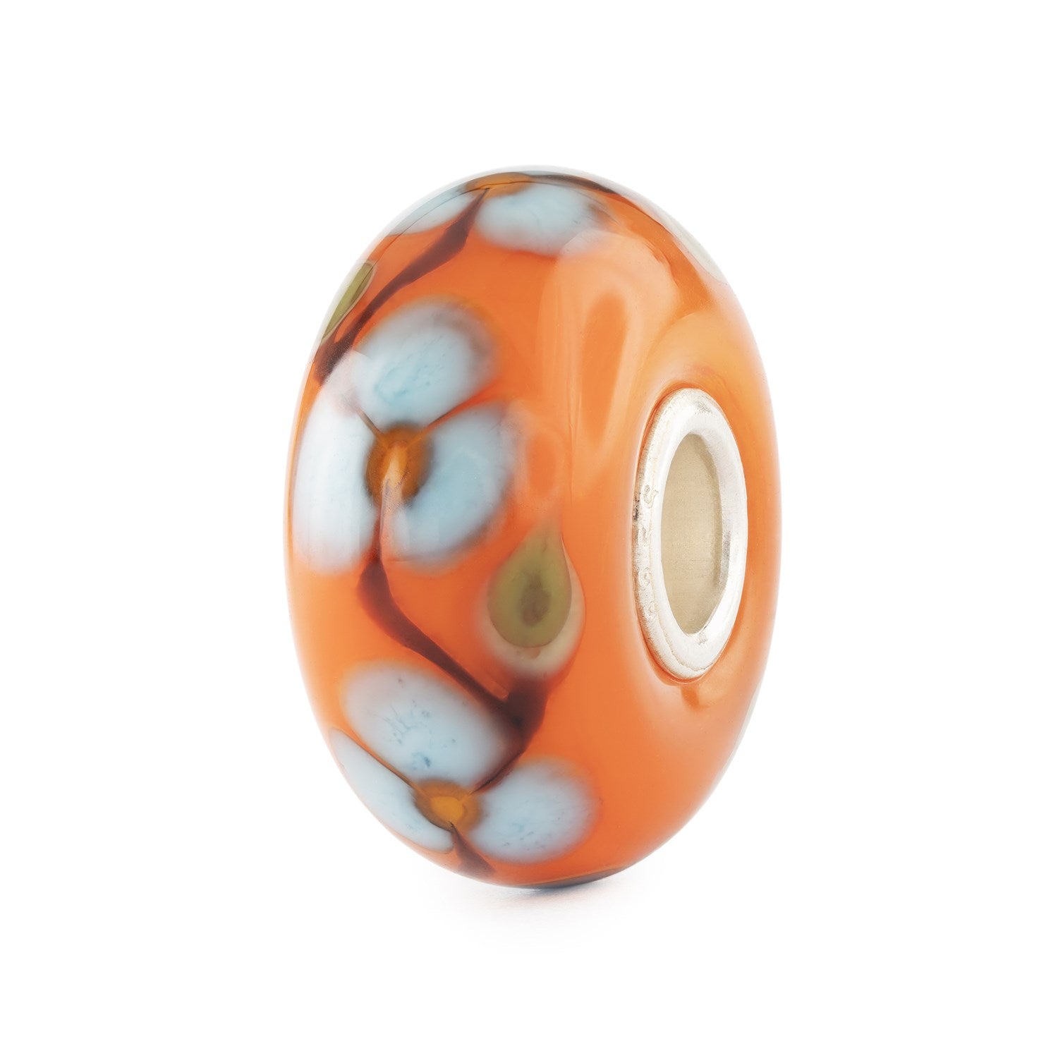 This glass bead has a classic shape and smooth surface, presenting incredible details. Blue flowers bloom on brown branches on a deep dark orange backdrop. The bead has a clean and simple look, yet at the same time, being incredibly detailed. A sterling silver core adds a refined finish, making it as enduring as it is radiant.