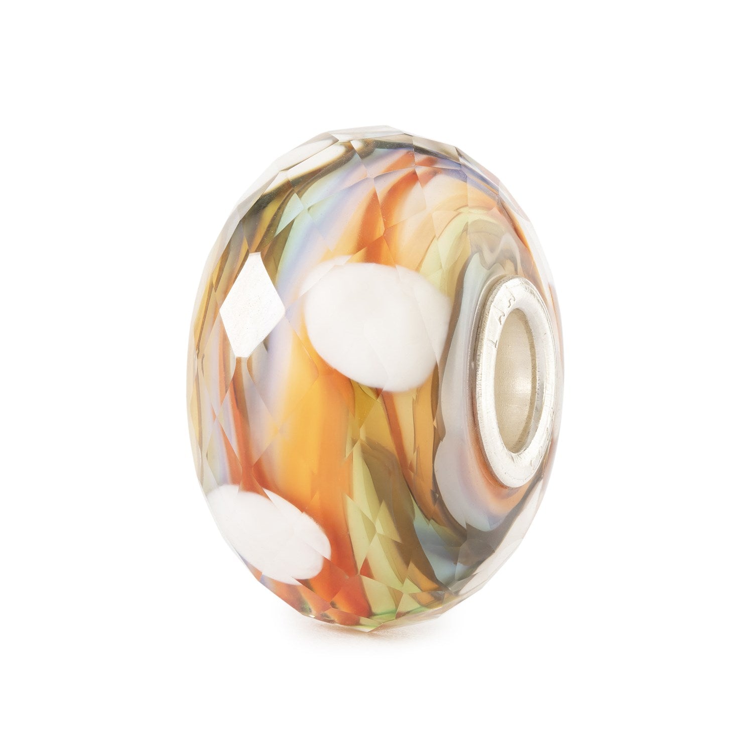 This faceted glass bead catches the light beautifully, with warm rainbow tones that flow in soft stripes through the deeper layers of glass, while wisps of white — like drifting clouds — float gracefully above. A sterling silver core adds a refined finish, making it as enduring as it is radiant.