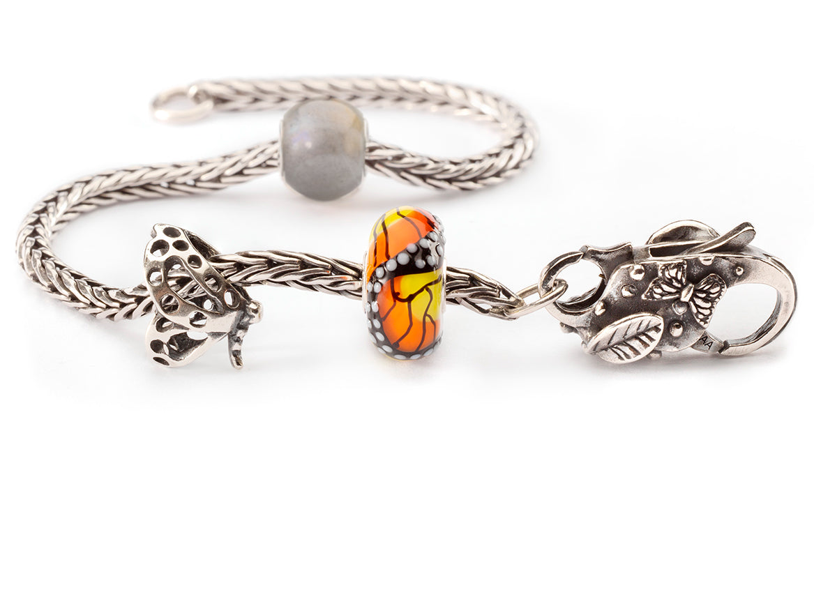 Sterling silver Trollbeads foxtail bracelet with the round labradorite bead, a silver butterfly bead, the orange and yellow monach butterfly bead in glass and a butterfly clasp