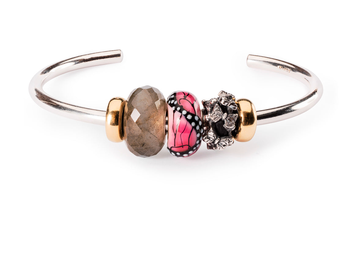 silver Trollbeads bangle with gold spacers and faceted labradorite bead, pink butterfly glass bead and a silver spacer with many small butterflies