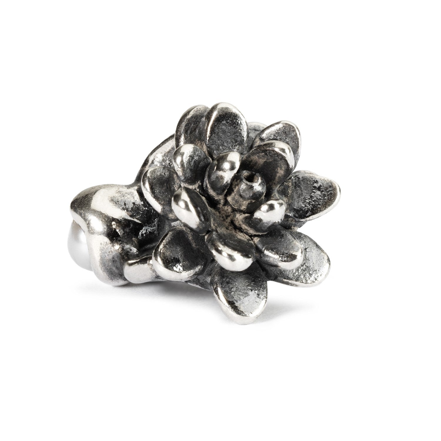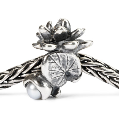 A sterling silver bracelet decorated with the stunning birth flower of July. Water lily in silver shielding a white freshwater pearl beneath its petals. The bracelet is finished with a decorative Lace Clasp. A fine and exclusive gift for July birthdays and occasions.
