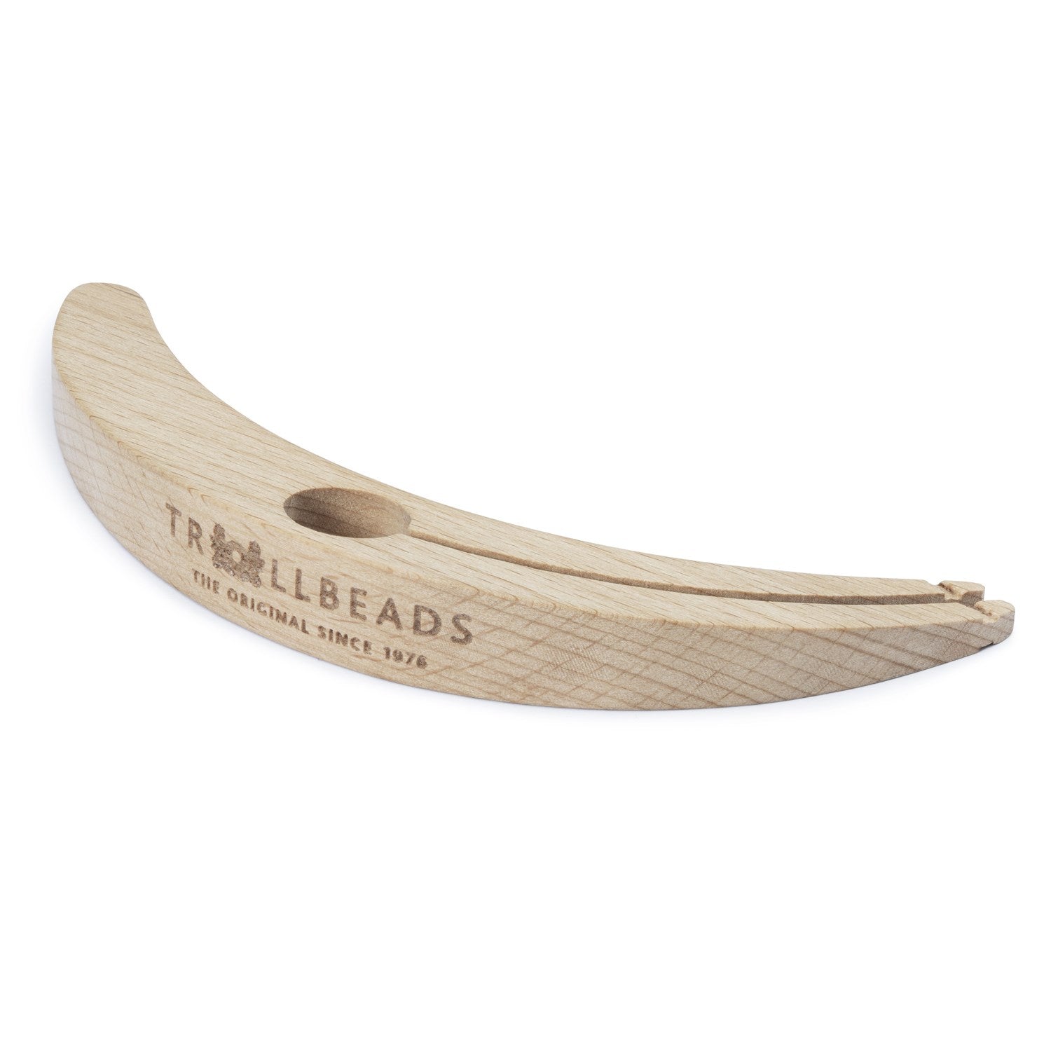 Acest instrument din lemn vă ajută să vă fixați brățara. Doar fixați partea cu anoul cel mare în clema de lemn și atașați partea cu încuietoarea. Voilà!