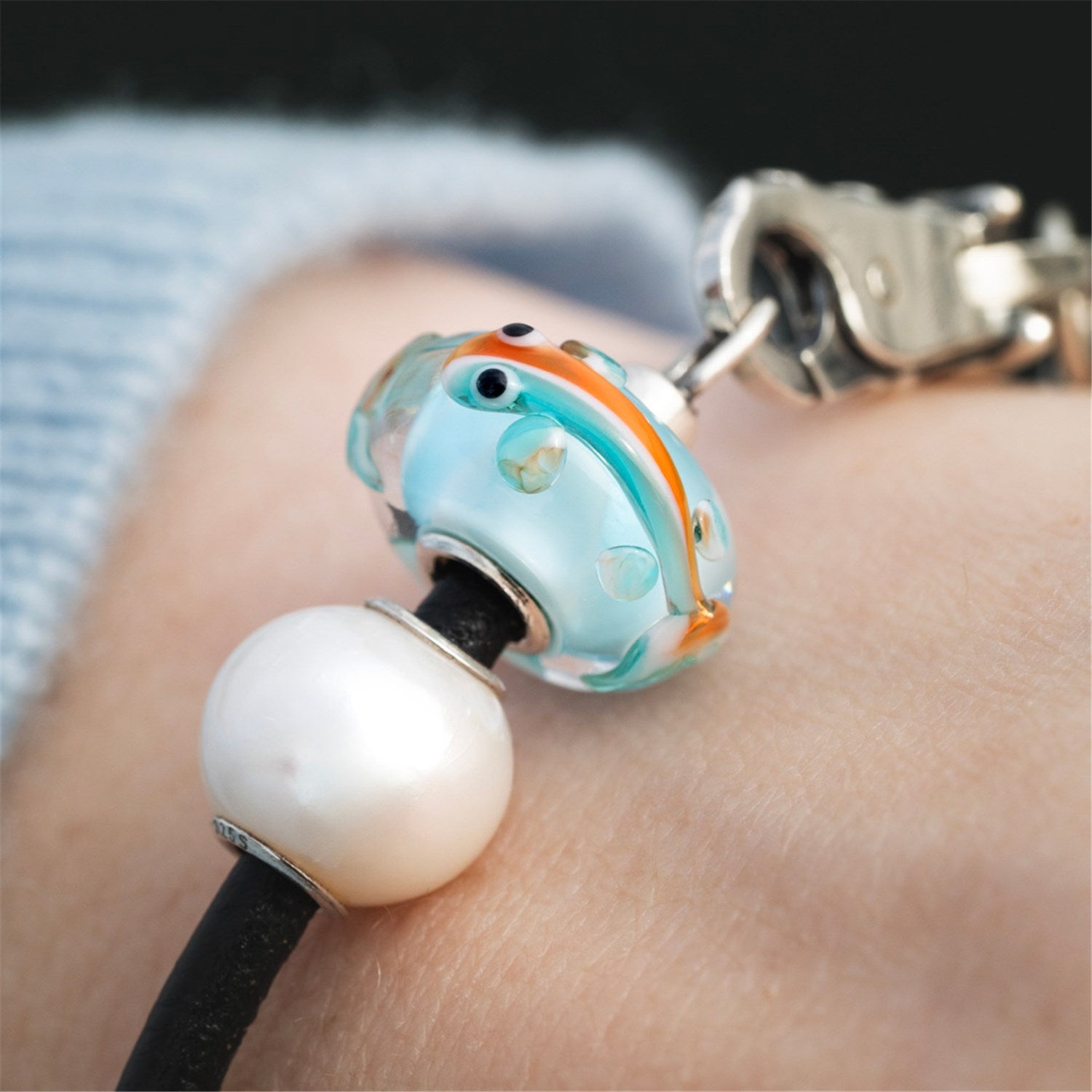 • Nu trebuie să înoți niciodată în timp ce porți talismane Trollbeads de sticlă, mai ales într-o piscină cu clor. Nu le scufunda niciodată în apă fierbinte sau în apă de mare. Acest lucru le-ar putea deteriora.